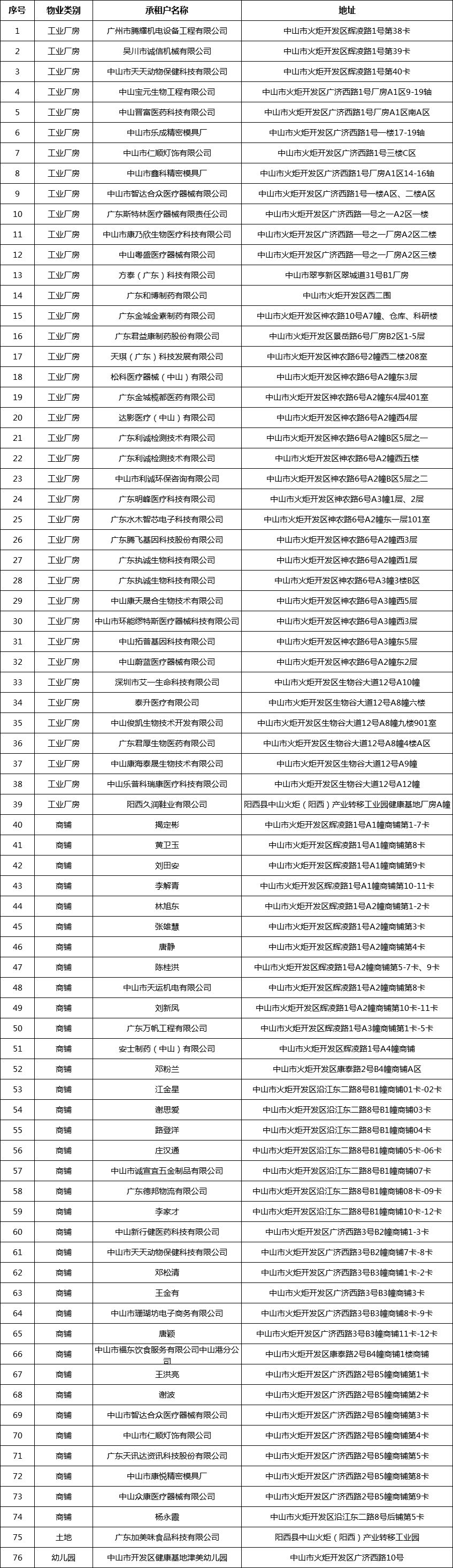 中山市健康科技產業(yè)基地發(fā)展有限公司關于經營性物業(yè)、土地租金減免名單的公示