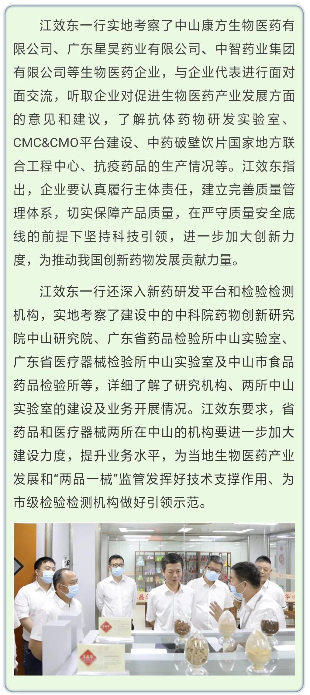 5月25日,廣東省藥品監(jiān)督管理局黨組書記、局長江效東一行赴中山市就生物醫(yī)藥產(chǎn)業(yè)發(fā)展與藥品安全監(jiān)管工作開展調(diào)研,實(shí)地考察了健康基地園區(qū)生物醫(yī)藥企業(yè)及研究和檢驗(yàn)檢測機(jī)構(gòu)。中山市市委書記賴澤華、市長危偉漢、副市長雷岳龍參加了座談交流。