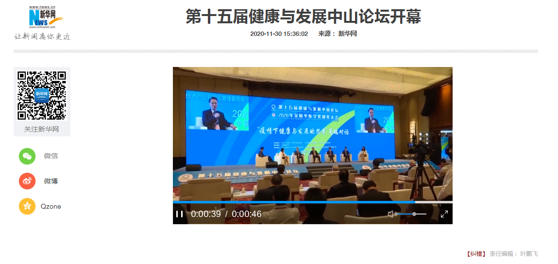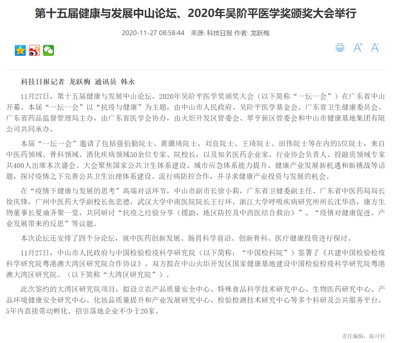 11月27日,第十五屆健康與發(fā)展中山論壇、2020年吳階平醫(yī)學(xué)獎(jiǎng)?lì)C獎(jiǎng)大會(huì)(以下簡(jiǎn)稱“一壇一會(huì)”)在廣東省中山開幕。大會(huì)取得圓滿成功,人民日?qǐng)?bào)、新華網(wǎng)、中國新聞社、科技日?qǐng)?bào)、經(jīng)濟(jì)日?qǐng)?bào)等央媒,醫(yī)藥經(jīng)濟(jì)報(bào)、健康界等行業(yè)媒體,南方日?qǐng)?bào)、羊城晚報(bào)等省級(jí)媒體,中山日?qǐng)?bào)、中山電視臺(tái)等都對(duì)大會(huì)進(jìn)行了詳細(xì)報(bào)道。