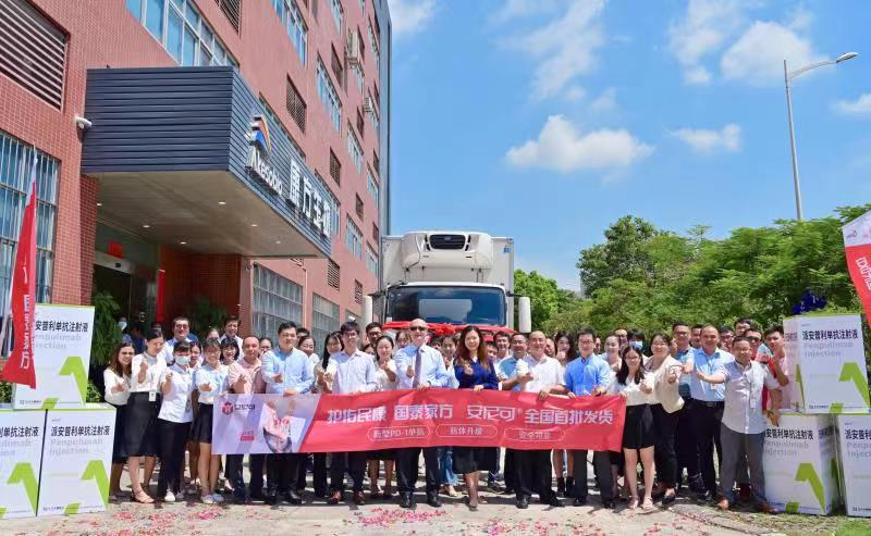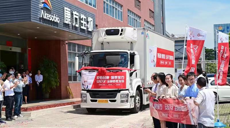 2021年8月21日上午10點(diǎn)30分,百花怒放、碩果累累的盛夏中山,滿載逾20,000支新型抗腫瘤藥物派安普利單抗注射液(商品名:安尼可®)的冷鏈貨車緩緩從中山國家健康基地康方生物本部生產(chǎn)基地駛出。