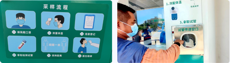 除此之外,“小屋”的外部還配置測溫器、掃碼器、試管傳遞窗口、擴(kuò)音器等便民設(shè)施,以及醫(yī)療廢物放置柜、試管放置柜、試管架放置處、手部消殺等采樣配置,功能齊全。