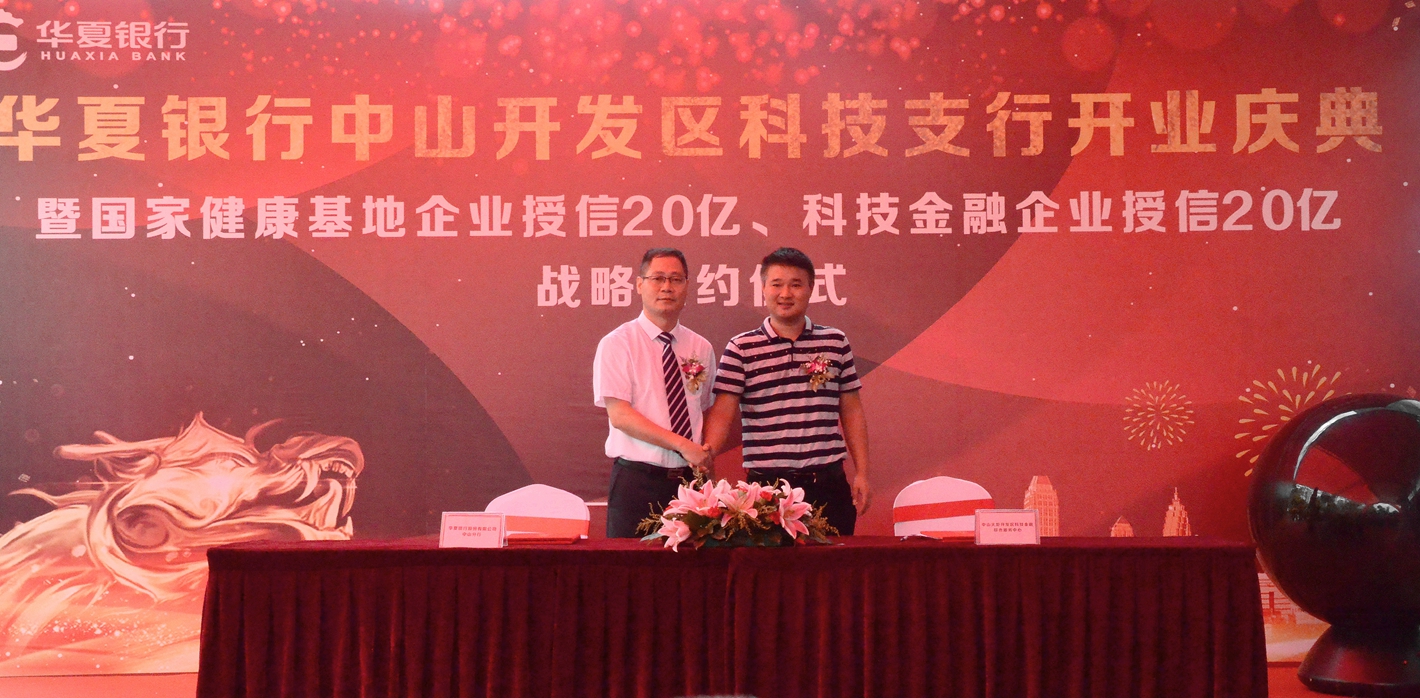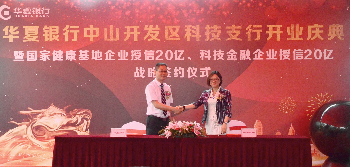 開業(yè)慶典現(xiàn)場,國家健康基地與華夏銀行中山分行簽訂了戰(zhàn)略合作協(xié)議,健康基地園區(qū)企業(yè)獲得華夏銀行中山分行20億元的授信額度。在金融產(chǎn)品創(chuàng)新方面,華夏銀行中山分行將以“以貸促投,以投引貸”為導向,創(chuàng)新發(fā)展投貸聯(lián)動、投債聯(lián)動、投保聯(lián)動、風險準備金擔保貸款等新模式,協(xié)助健康基地建設多層次的投融資體系。
