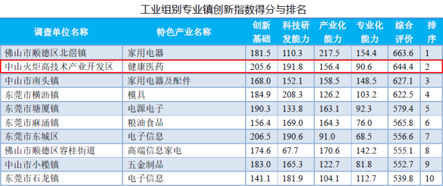 廣東省專業(yè)鎮(zhèn)創(chuàng)新指數(shù)評價報告針對中山火炬區(qū)健康醫(yī)藥產(chǎn)業(yè)專業(yè)鎮(zhèn)的創(chuàng)新排名,來源于健康基地已建成的涵蓋研發(fā)、中試、檢驗檢測、成果轉(zhuǎn)化、資本金融、孵化加速全過程的、具有生命力的產(chǎn)業(yè)創(chuàng)新體系。
