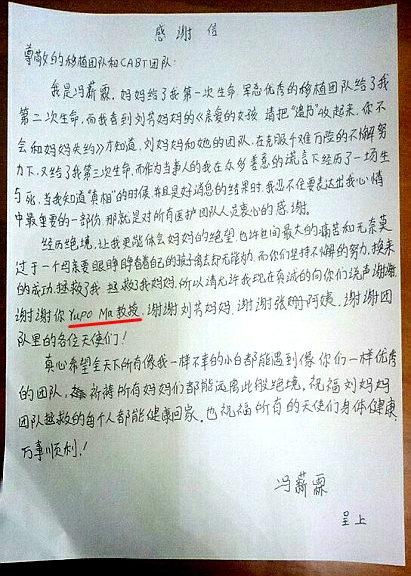 病情穩(wěn)定后,小霖花給主治團(tuán)隊(duì)和歸氣丹公司寫了一封感謝信。文中第一個(gè)感謝的“Yupo Ma教授”,就是該項(xiàng)技術(shù)的國際專利持有者馬鈺波教授。Yupo Ma教授的另一個(gè)身份是歸氣丹生物醫(yī)藥(中山)有限公司的主席兼創(chuàng)始人,而歸氣丹生物醫(yī)藥(中山)有限公司于20178月簽約落戶國家健康基地,治療小霖花的細(xì)胞免疫新型技術(shù)就出自該公司臨床研究用CARVac技術(shù)。