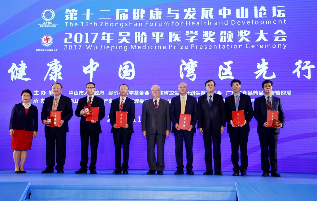 原衛(wèi)生部副部長朱慶生(中)、中山市委書記、市人大常委會(huì)主任陳旭東(右三)為2017年吳階平醫(yī)藥創(chuàng)新獎(jiǎng)獲獎(jiǎng)?wù)咄跛伸`教授(左二)、李建生教授(左三)、龔啟勇教授(左四)、屠鵬飛教授(右四)、蔣建新研究員(右二)、高興華教授(右一)頒獎(jiǎng),并與吳階平醫(yī)學(xué)基金會(huì)理事長曉萌(左一)合影留念