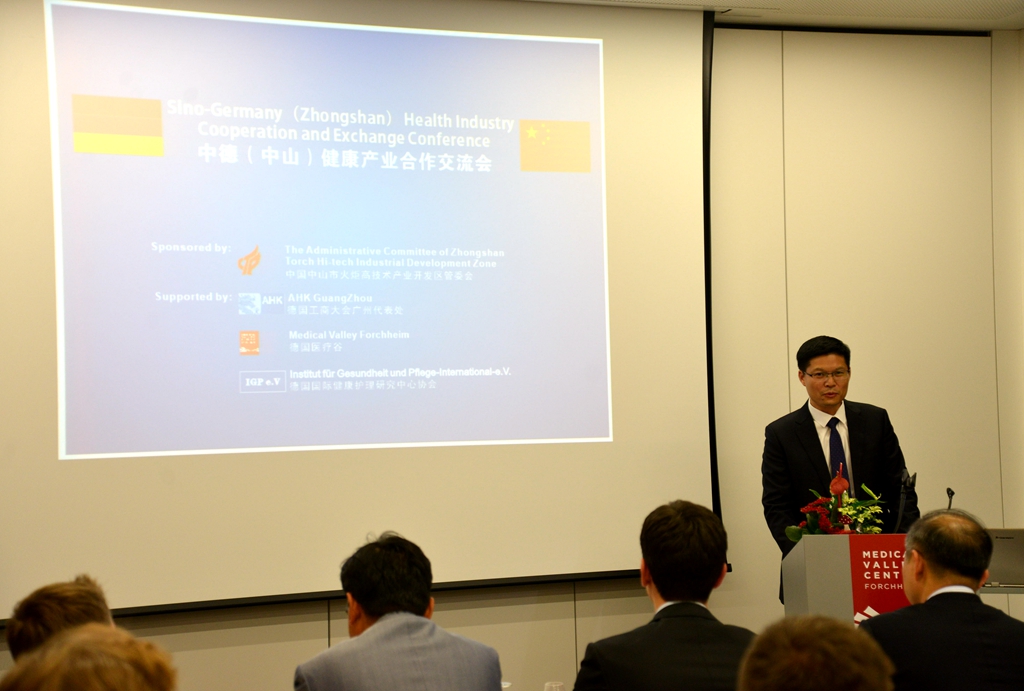 德國當?shù)貢r間921日晚,由市委常委、火炬開發(fā)區(qū)黨工委書記、翠亨新區(qū)黨工委書記侯奕斌率領的中山市經(jīng)貿(mào)代表團(下稱:經(jīng)貿(mào)團)在德國紐倫堡大區(qū)Forchheim市組織召開了中德健康產(chǎn)業(yè)合作推介會。此次合作交流會由中山火炬開發(fā)區(qū)主辦,得到德國工商大會廣州代表處、德國醫(yī)療谷、德國國際健康護理研究中心協(xié)會的大力支持。