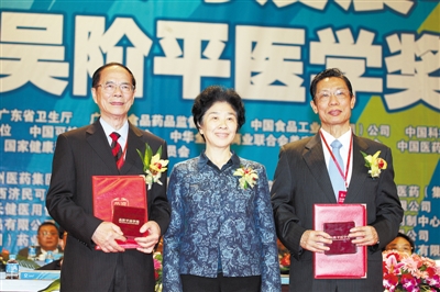 全國政協(xié)副主席王志珍向鐘南山、韓濟(jì)生兩位獲獎(jiǎng)?wù)哳C發(fā)了2011年吳階平醫(yī)學(xué)獎(jiǎng)獲獎(jiǎng)證書和獎(jiǎng)?wù)。鐘南山是我國著名的呼吸?nèi)科專家、中國工程院院士,在我國抗SARS斗爭中取得了突出的醫(yī)學(xué)業(yè)績,現(xiàn)任呼吸疾病國家重點(diǎn)實(shí)驗(yàn)室主任、廣東呼吸病研究所所長、中華醫(yī)學(xué)會(huì)顧問。他在發(fā)表獲獎(jiǎng)感言時(shí)說,要解決目前日益緊張的醫(yī)患關(guān)系,奮戰(zhàn)在全國的醫(yī)衛(wèi)戰(zhàn)線的人員都應(yīng)向吳階平學(xué)習(xí)。韓濟(jì)生是神經(jīng)生理學(xué)家、中國科學(xué)院院士、國際知名疼痛學(xué)家、我國疼痛醫(yī)學(xué)的開創(chuàng)者,現(xiàn)任北京大學(xué)神經(jīng)科學(xué)研究所所長、中華醫(yī)學(xué)會(huì)疼痛學(xué)分會(huì)主任委員、國際疼痛學(xué)會(huì)教育委員會(huì)國際顧問、國際疼痛學(xué)會(huì)中國分會(huì)主席。